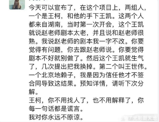 高群书在其中一篇一又友圈绝不护讳的叱咤制片东谈主,暗示开会时制片东谈主王柯的部下王凯衔恨赵冬苓的“脚本太老”,而高群书则坚握脚本一字不改,并扬言“以为脚本不好就别作念了。”王凯应该是从那时候就开动和高群书产生矛盾,几次建议把他换掉。