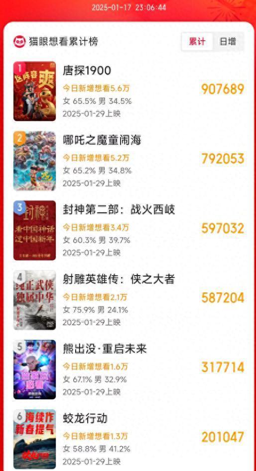 松手发稿,《唐探1900》的累计想看东说念主数也曾提高90万,是2025春节档通盘大片中数据弘扬最佳的。看来固然《唐探3》让影迷失望,但对唐探系列电影宇宙如故相比期待的。