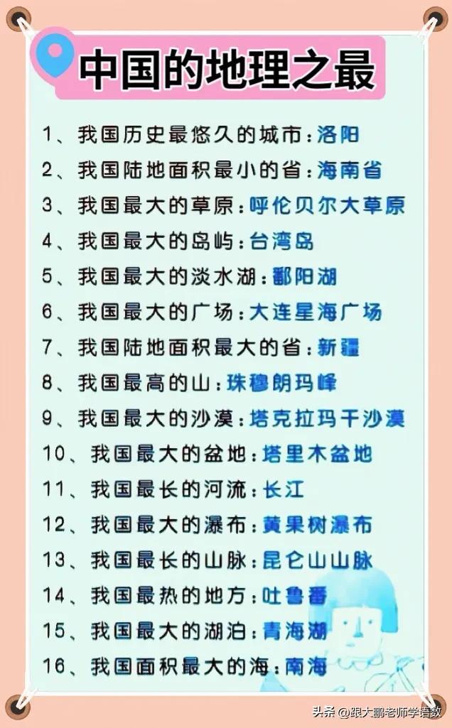 我的天啊,中国地舆之最真实让东谈主径情直行,每一项都是咱们国度的豪恣,值得储藏保存!如洛阳行为我国历史最悠久的城市,承载着镇静的历史文化。而海南省,诚然陆大地积最小,却以其独到的热带景观引诱着浩荡旅客。呼伦贝尔大草原,茫无垠际,是我国最大的草原,牛羊成群,绿波徬徨。台湾岛,行为我国最大的岛屿,山海壮丽,物产丰富。鄱阳湖,我国最大的淡水湖,水天一色,生态千般。大连星海广场,行为我国最大的广场,是市民闲隙文娱的好去向。
