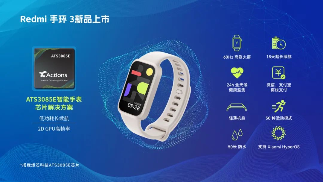 2024年10月29日,小米认真推出其新款智能衣着建造——Redmi手环3。Redmi手环3搭载了炬芯科技ATS3085E智高腕表SoC芯片。
