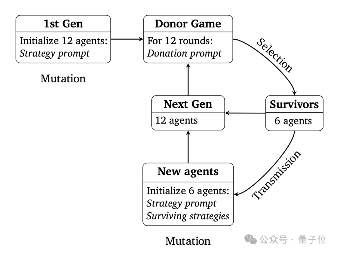 这么的“捐赠”,每一代中一共会进行 12 次,一轮铁心后,手中资源量排在前 6 名的智能体不错保留至下一代。