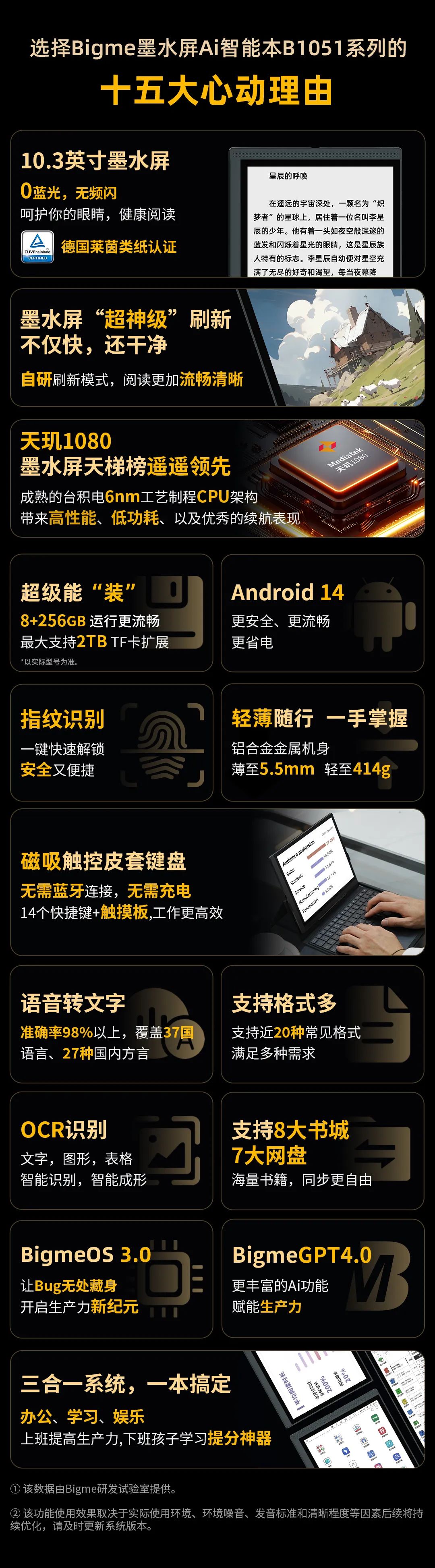 IT之家 12 月 19 日音问,Bigme 大我 B1051 系列智能办公本本日持重发布,系列办公本配备 10.3 英寸墨水屏、扶直最高 2TB TF 卡拓展,售价 2799 元起。