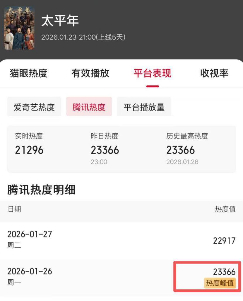 历史大剧《太平年》于央一播出,鹅厂、奇异果、芒果等聚拢网播,热度峰值龙套23000,热度透顶炸了!