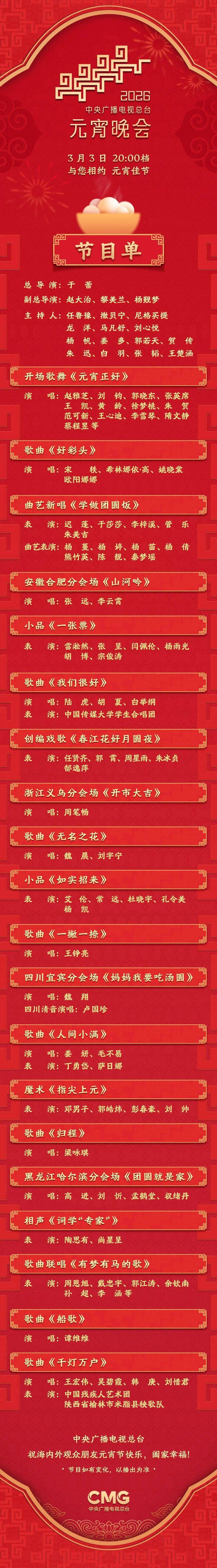 今晚8点档,中央播送电视总台《2026年元宵晚会》将在央视概述频谈(CCTV-1)、综艺频谈(CCTV-3)、汉文国际频谈(CCTV-4)、戏曲频谈(CCTV-11)、音乐频谈(CCTV-15)以及4K超高清频谈、8K超高清频谈等电视频谈,音乐之声、经典音乐播送、文艺之声、大湾区之声、台海之声、华语环球播送、南海之声等播送频率,央视新闻、央视频、云听客户端和央视网、央广网、国际在线等新媒体平台同步播出,跟随大家华东谈主和国外一又友共度团圆喜乐、温馨和好意思的元宵佳节!