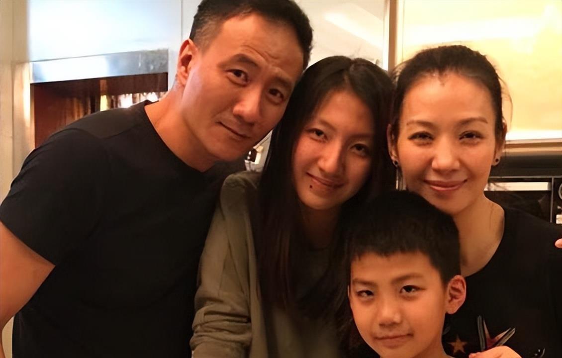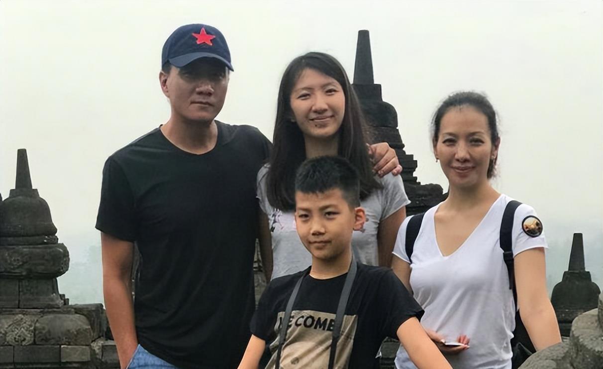 两个孩子分袂站在父母双方,胡军一边搂着爱妻、一边搂着女儿,脸上的笑貌障翳不住的欢快。