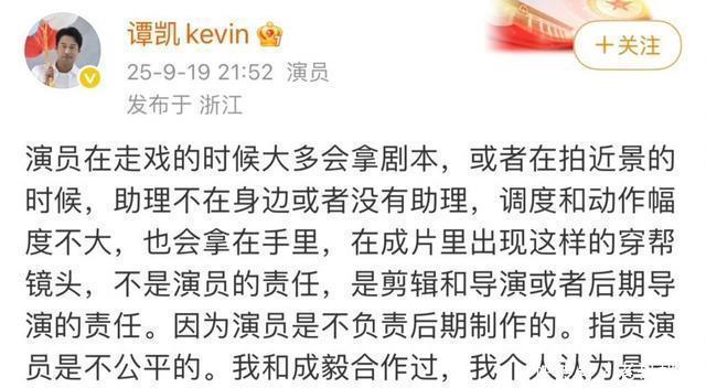 对此,不少业内东谈主士勇敢站出来为他发声,其中就包括谭凯。 今天(9月19日)晚上10点傍边,谭凯说,演员走戏拿脚本是业内再正常不外的事情,成片出现穿帮镜头是裁剪和导演或后期导演的问题,责怪演员起义正。他提到和成毅贯串过,以为他是一个敬业谦善的后生演员。