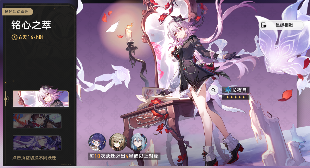 上半复刻卡池里的3个变装,玩记挂队可抽永夜月,玩Dot队可抽海瑟音和黑天鹅。不外星铁当前变装和军队更新换代很快,不是很推选抽复刻变装,仍是攒着星琼抽新变装吧。