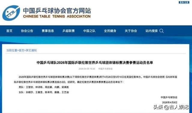 2026年4月8日开云体育,中国乒协崇敬公布了伦敦世乒赛团体赛的男队参赛名单。