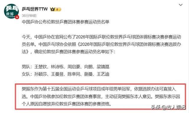 公告中写得清皑皑白:樊振东行为第十五届寰球开通会男单冠军,依据给与方针本可胜利入选;中国乒协就参赛事宜主动研究了樊振东本东说念主的主张,他因个东说念主原因自觉毁灭参赛履历。